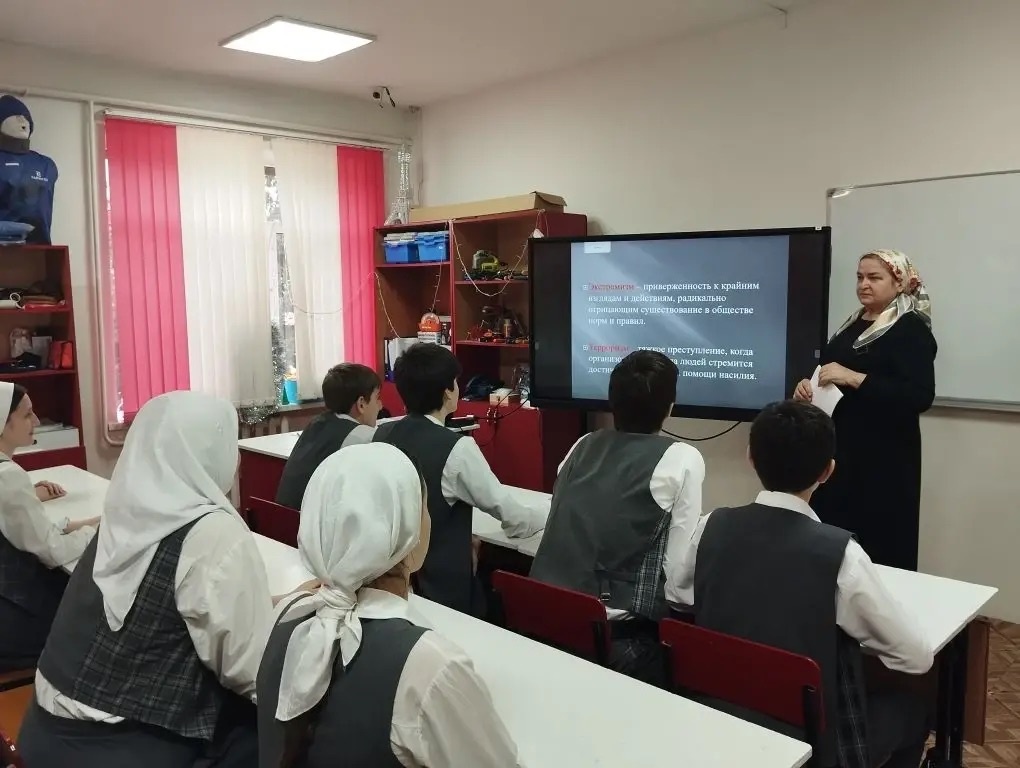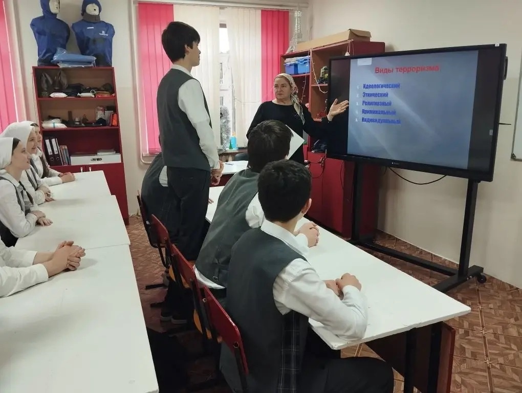 Классный руководитель Накаева Т.У. начала занятие с определения террора и его видов, акцентировав внимание на том, как терроризм влияет на повседневную жизнь людей и на безопасность государства в целом. Были рассмотрены примеры террористических актов, произошедших в разные времена и в разных странах, что помогло учащимся лучше понять масштабы этой проблемы.
