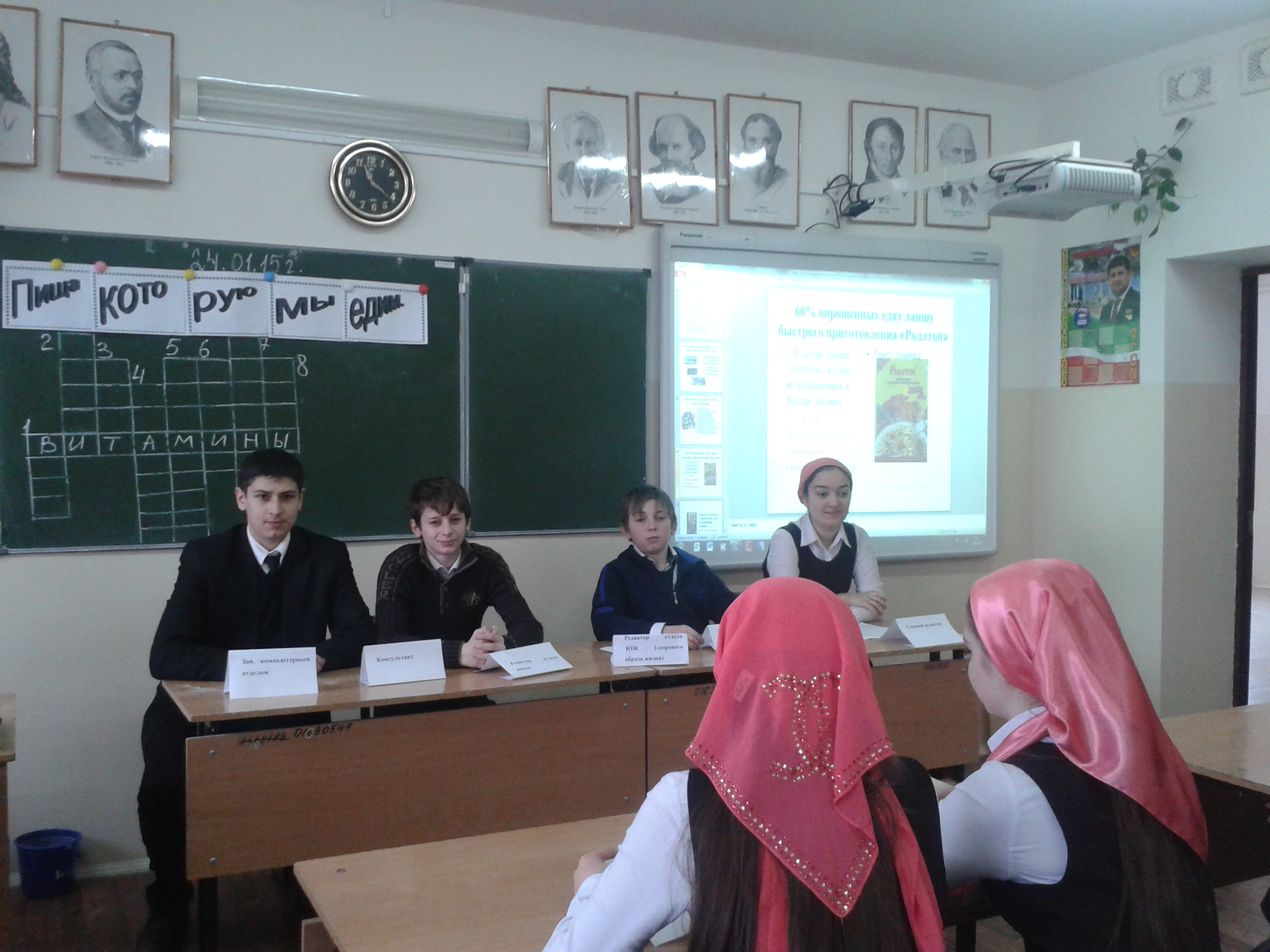 24.01.2015В МБОУ СОШ №4 в рамках проведения предметной недели по химии, биологии, географии в форме устного журнала прошел урок химии на тему «Пища, которую мы едим». Урок прошел живо и интересно. Проблема питания очень актуальна в жизни каждого человека, поэтому учащиеся с интересом восприняли поднятую тему.