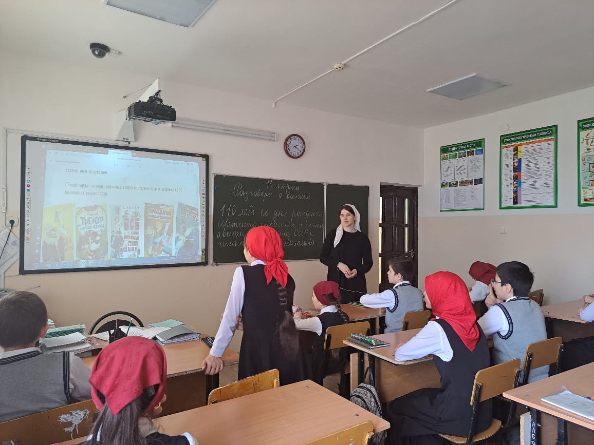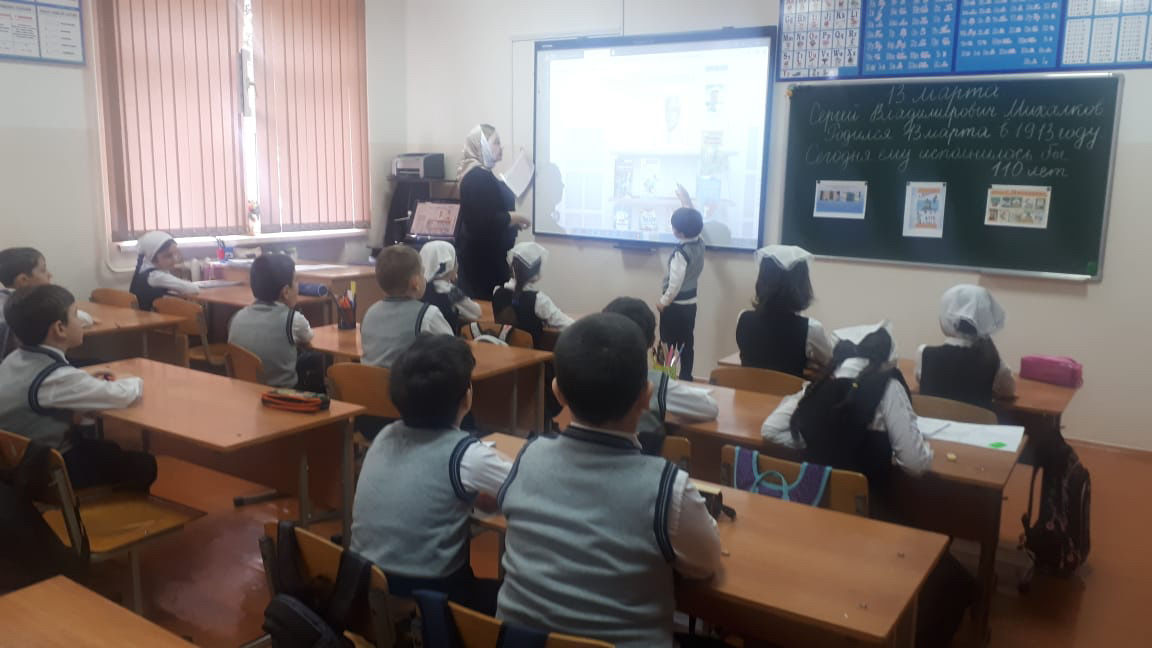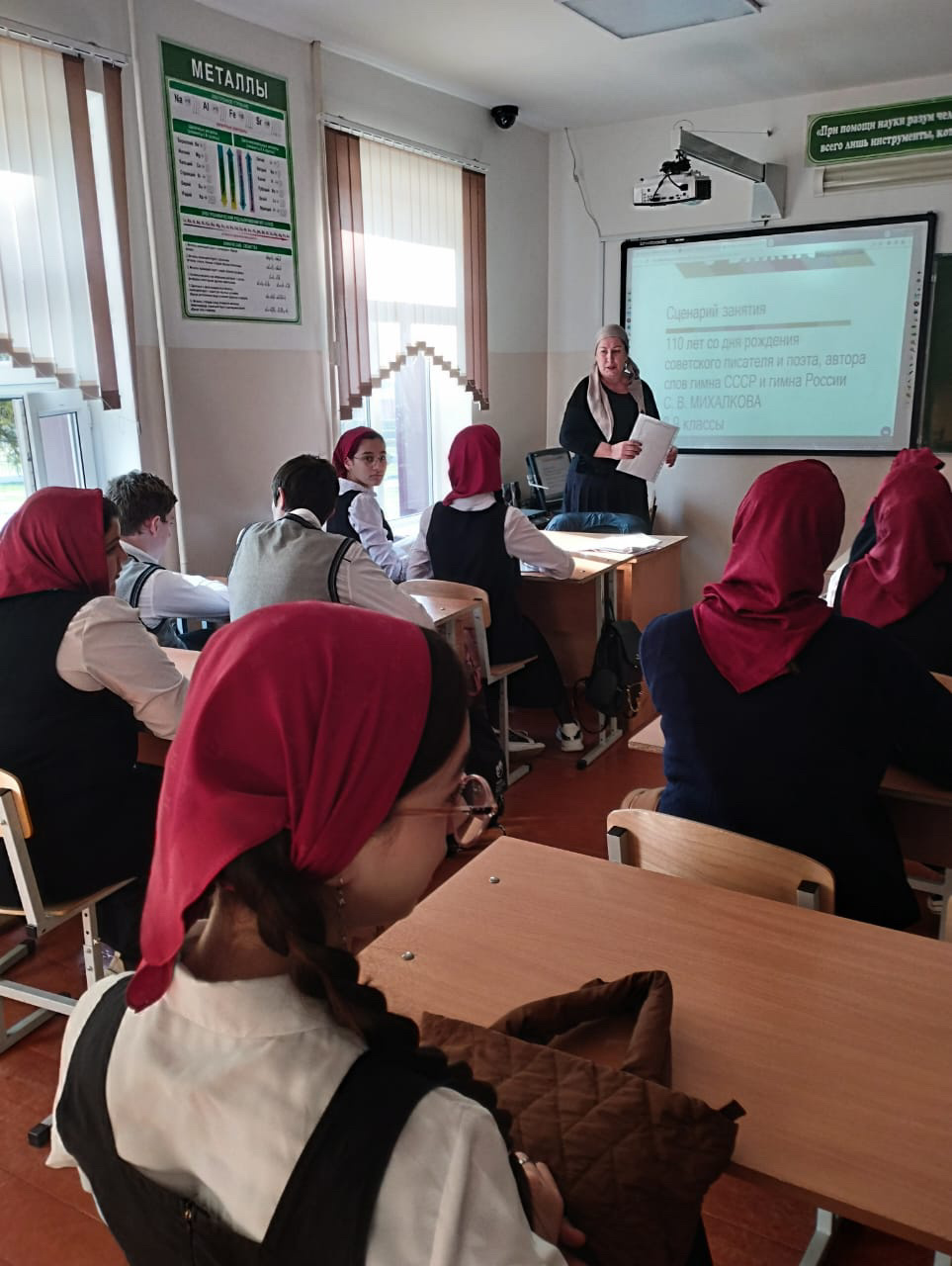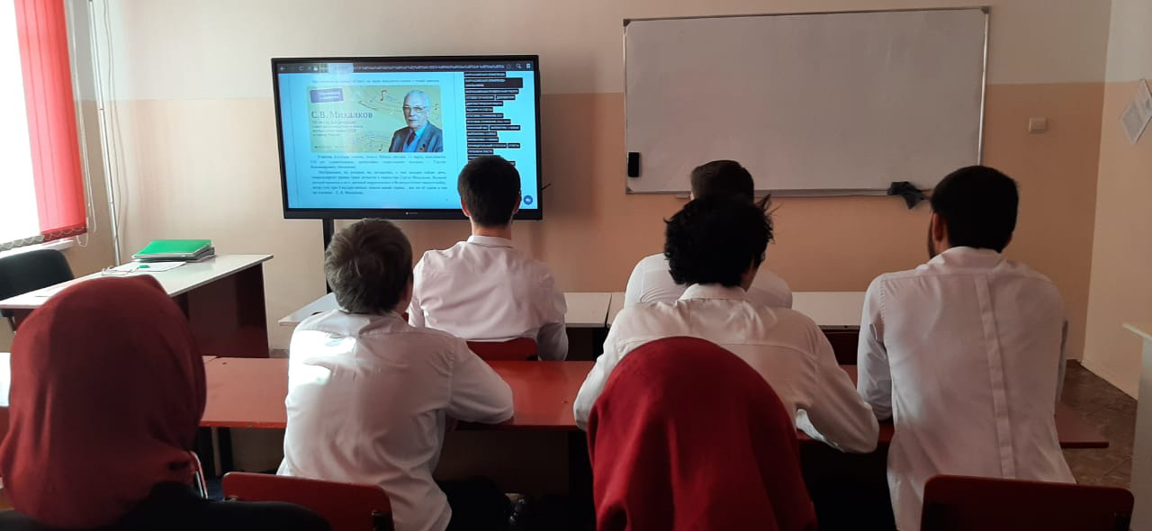Классный руководитель 8а класса Хажиева Зура Джунидовна начала свое занятие со слов: «Ребята, сегодня, 13 марта, исполняется 110 лет удивительному, необычайно талантливому человеку – Сергею Владимировичу Михалкову. Изображения, по которым вы догадались, о ком сегодня пойдет речь, символизируют разные грани личности и творчества Сергея Михалкова. Великий детский писатель и поэт, военный корреспондент в Великую Отечественную войну, автор слов трех Государственных гимнов нашей страны – все это об одном и том же человеке – С. В. Михалкове».