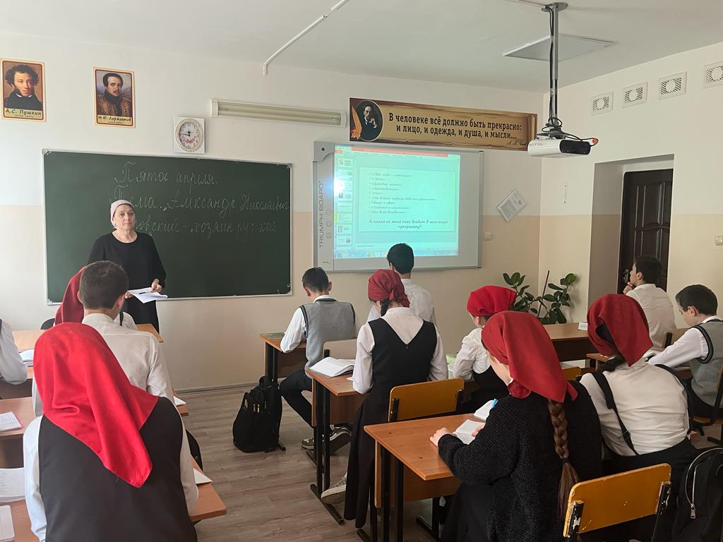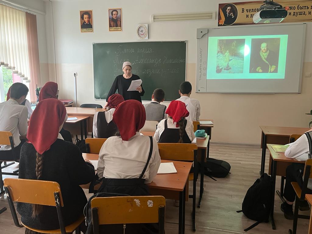 10.04.2023В рамках реализации национального проекта «Образование», в целях празднования 200-летия со дня рождения А.Н. Островского 10 апреля 2023 года в 8-х классах МБОУ «СОШ №4 с.Серноводское» проведен Всероссийский урок, посвященный 200-летию со дня рождения А.Н. Островского. Всероссийский урок «Александр Николаевич Островский - хозяин русской сцены» провела учитель русского языка и литературы Шаипова Елена Аптыевна.