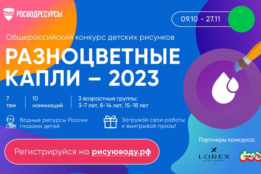 24.11.2023Федеральная агентство водного ресурса при поддержке Министерства природного ресурсов и экологии Российской Федерации проводит эколога просветительский общероссийский конкурс детских тематических рисунков "Разноцветные капли - 2023", посвященный вопросам бережного отношения к водным ресурсам.