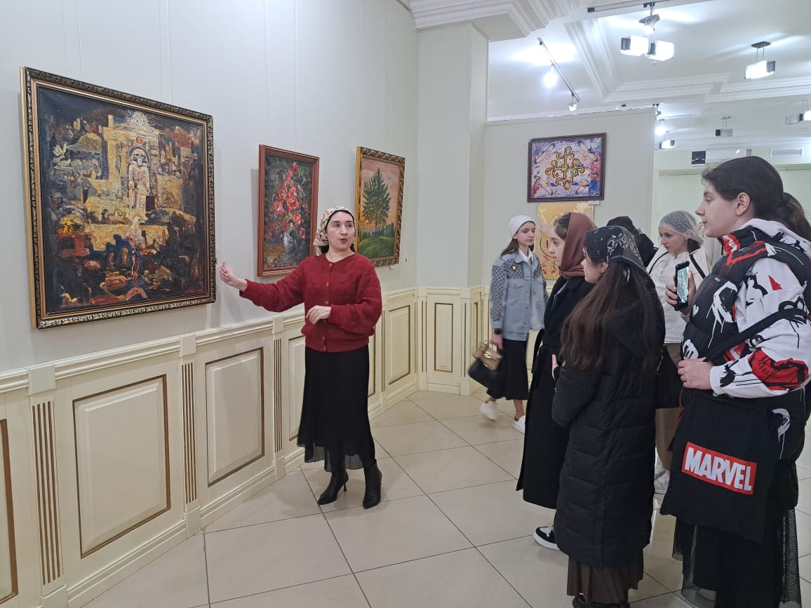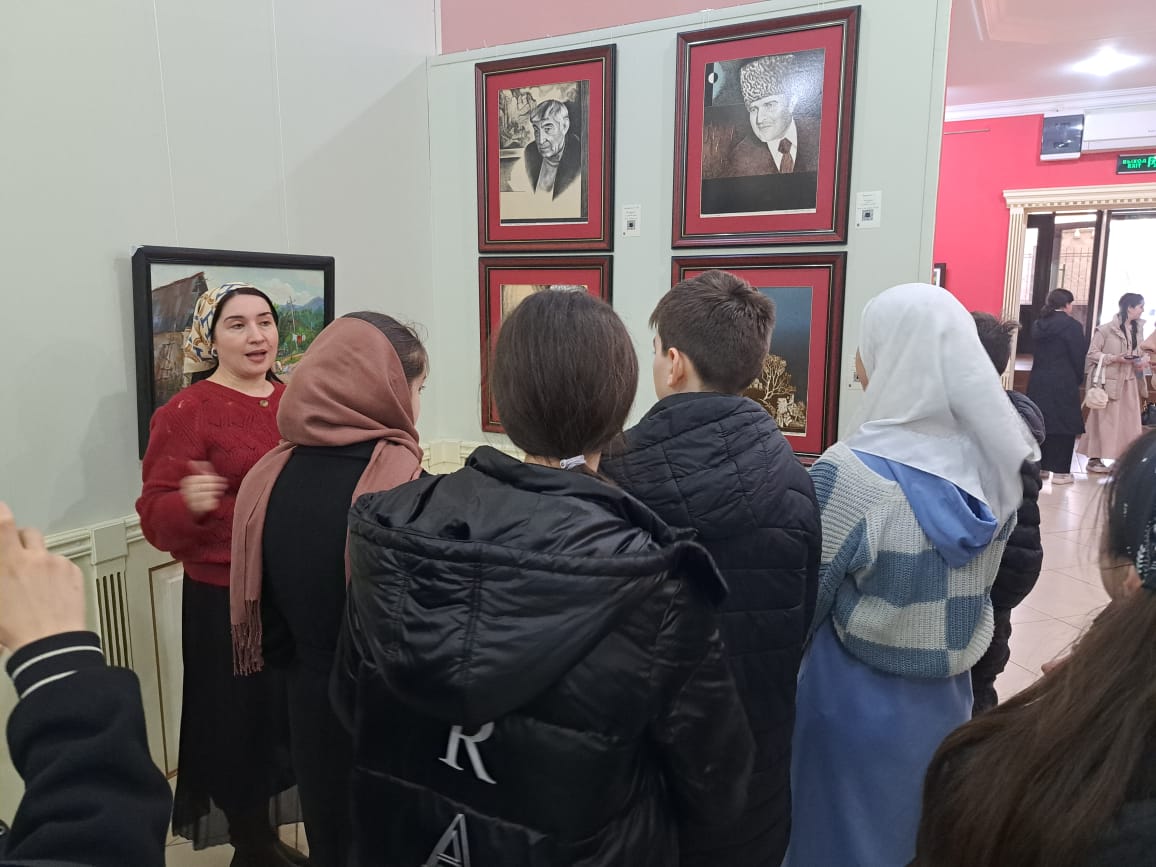 07.03.2024Экскурсия в галерею А.А.Кадырова7 марта 2024 года обучающиеся 6-7 классов МБОУ «СОШ No4»с.Серноводское» вместе с учителями посетили Государственную галереюимени Первого Президента Чеченской Республики, Героя России Ахмата-Хаджи Кадырова.В ходе экскурсии ребятам было представлено более 50 творческих работизвестных чеченских художников: Алхазова Ризвана Юсуповича, ЗакриеваМагомеда Хамидовича и Муцаева Рустама Юрьевича. Дети смогли увидетьживописные картины в разных художественных стилях, на которыхизображен чеченский колорит, невероятной красоты природа, горы,исторические родовые башни и поселения. Экскурсоводы галереипредложили для всех желающих подробную экскурсию по экспозиции.Выставка проводилась с целью популяризации изобразительного искусства итворчества чеченских художников.Музей - источник знаний; место, где оживает культура. Здесь собраныпредметы старины, коллекции, исторические документы, выстроенысодержательные экспозиции. Все это создает особую атмосферу погруженияв прошлое, дает возможность понять, прочувствовать, пережить историюсвоего народа. Это важно, - ведь только человек, знающий свое прошлое,способен ценить настоящее и создавать будущее.