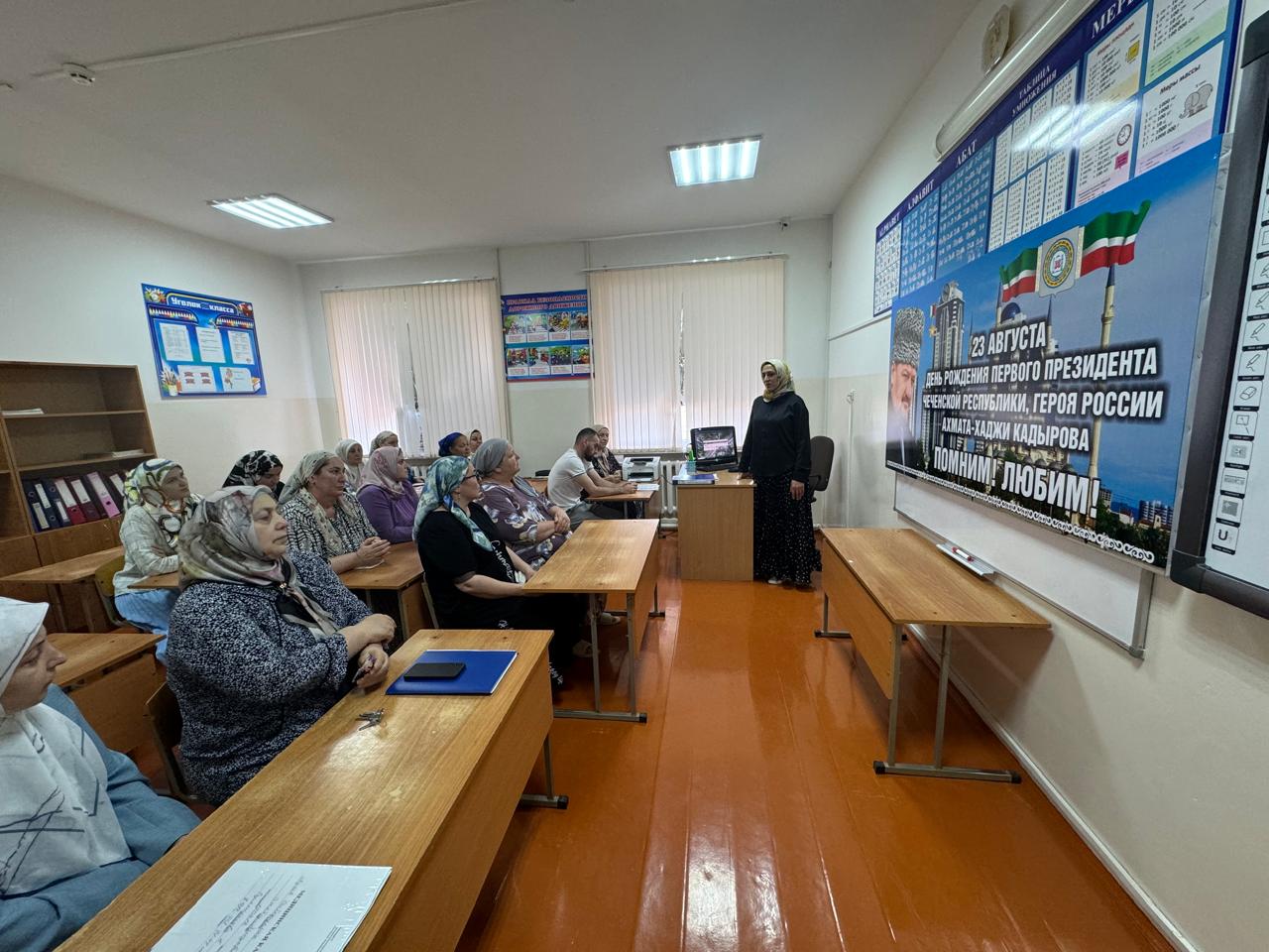 В ходе мероприятия директор школы Джабаева Танзила Акзуровна рассказала историю жизни А-Х.Кадырова и о том, как он пожертвовал своей жизнью, ради процветания и возрождения Чеченской Республики.