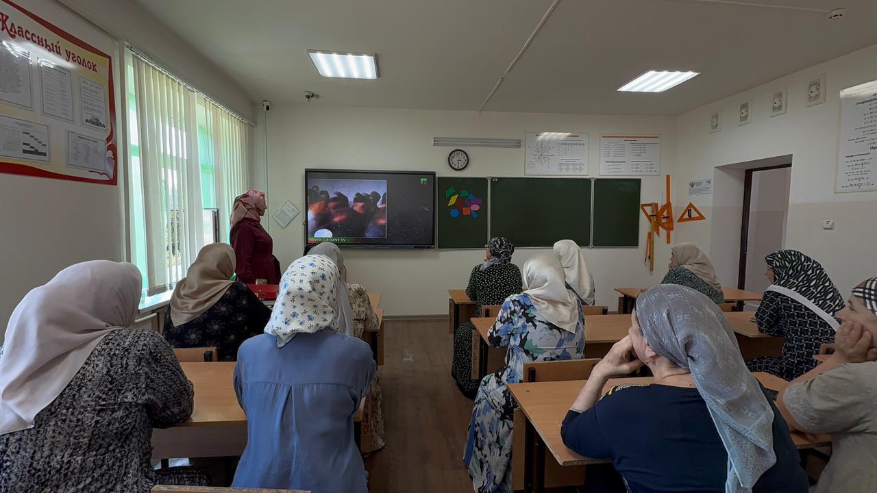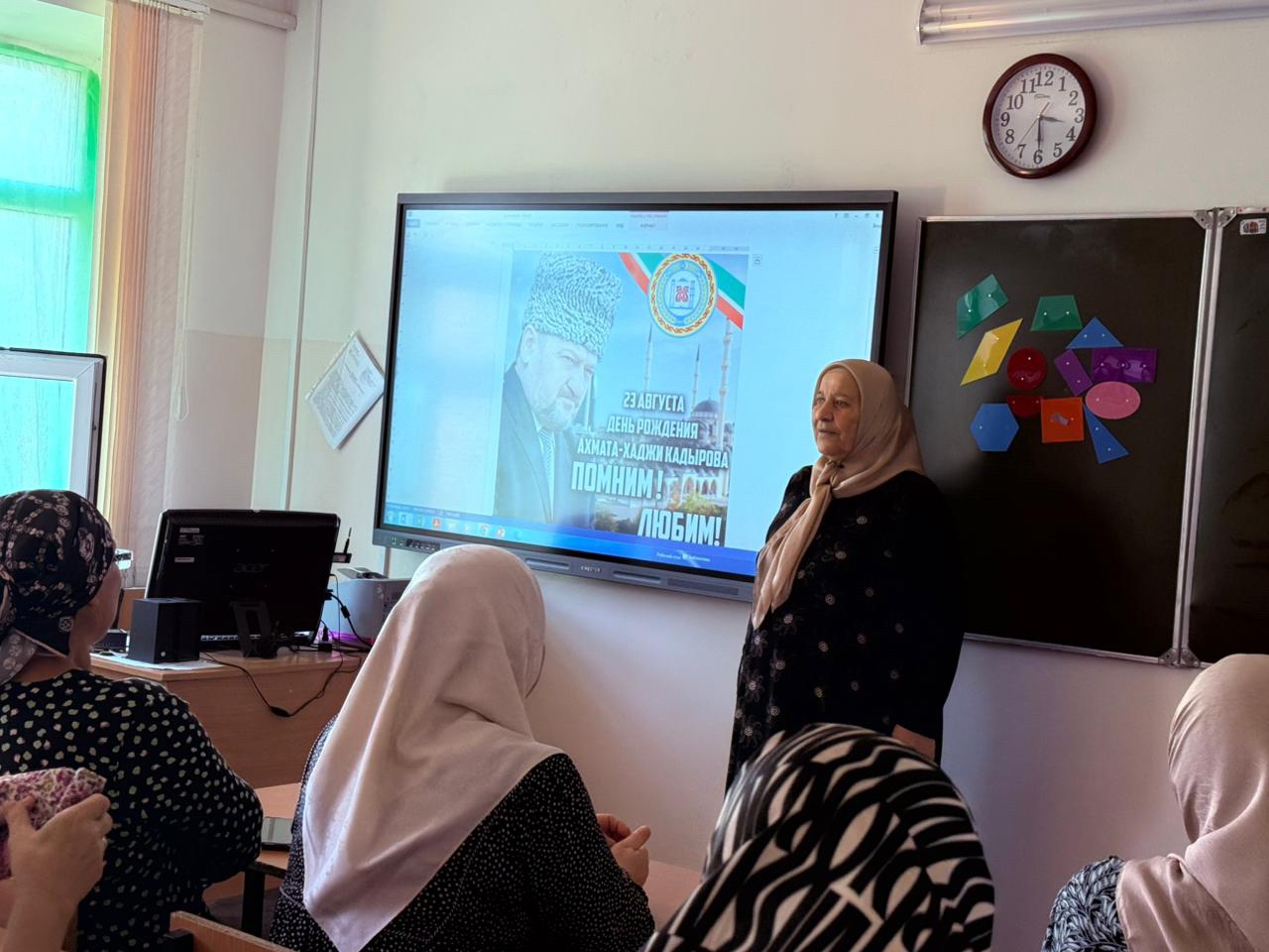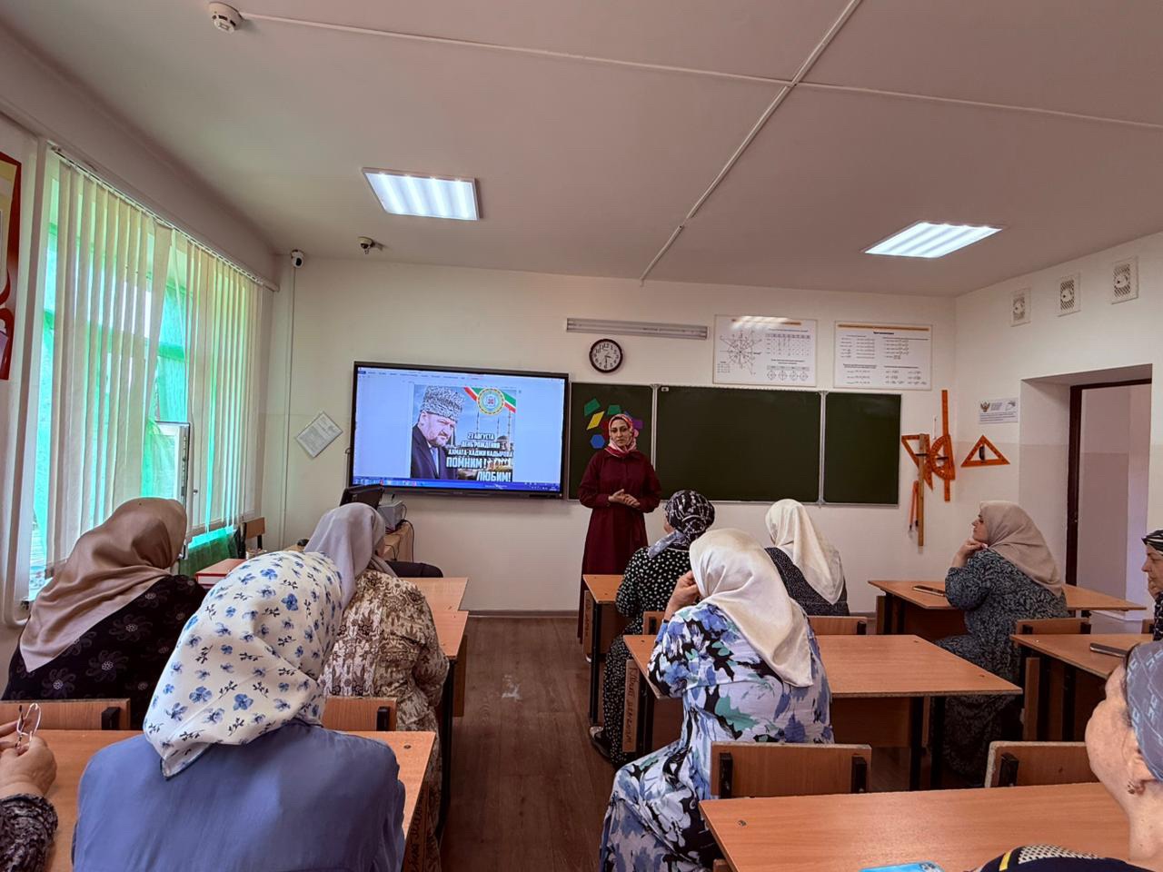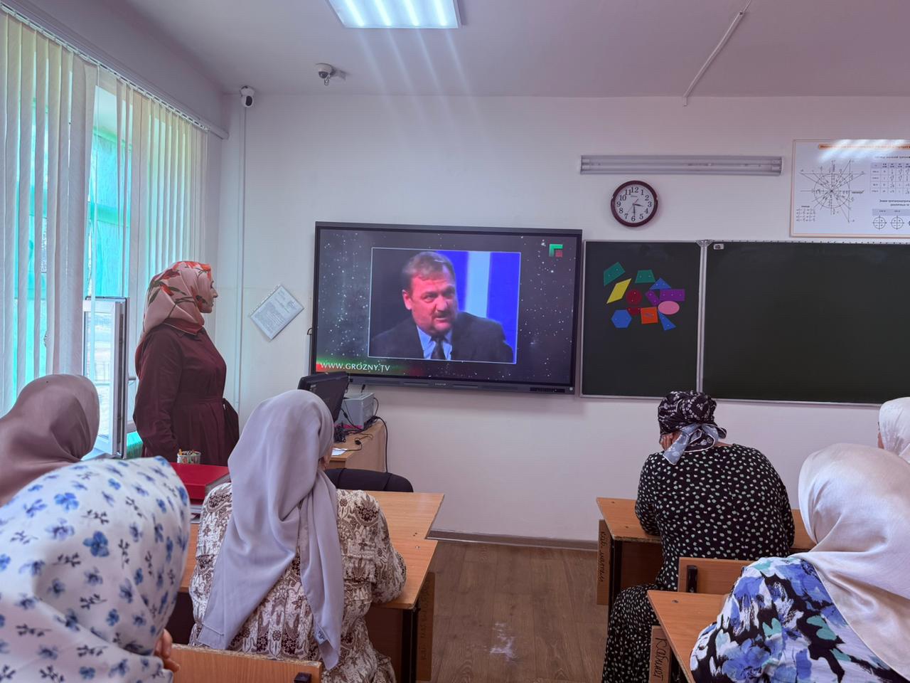 В ходе мероприятия директор школы Джабаева Танзила Акзуровна рассказала об А-Х.Кадырове и о том, как он пожертвовал своей жизнью ради процветания и возрождения Чеченской Республики.