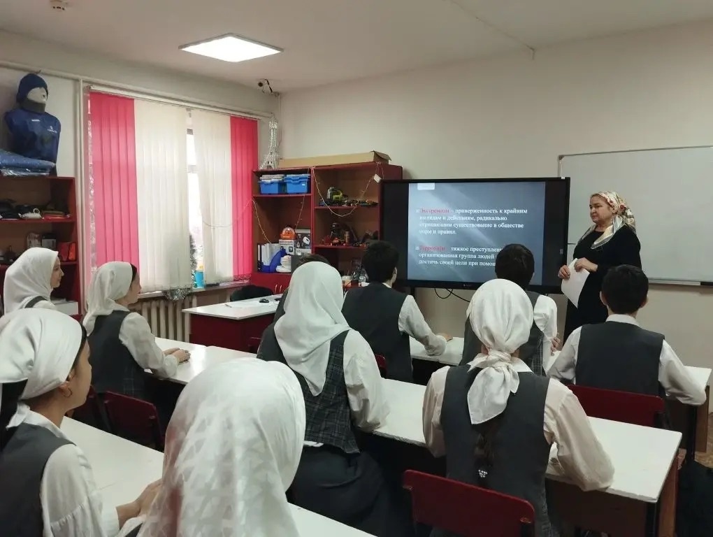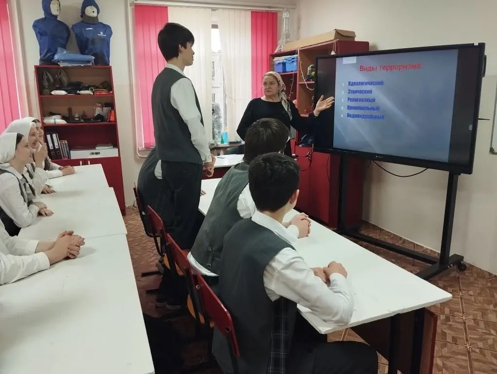 Классный руководитель Накаева Т.У. начала занятие с определения террора и его видов, акцентировав внимание на том, как терроризм влияет на повседневную жизнь людей и на безопасность государства в целом. Были рассмотрены примеры террористических актов, произошедших в разные времена и в разных странах, что помогло учащимся лучше понять масштабы этой проблемы.
