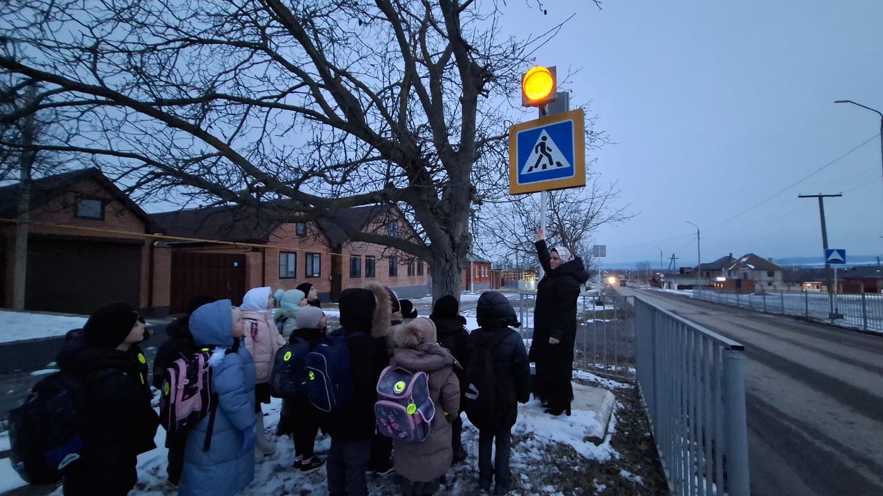 14.01.2026В рамках этого мероприятия первоклассники вместе с учителем вышли на дорогу, чтобы на практике закрепить знания о правилах дорожного движения. Дети одеты в яркую одежду и светоотражающие элементы, что делает их более заметными на улице.